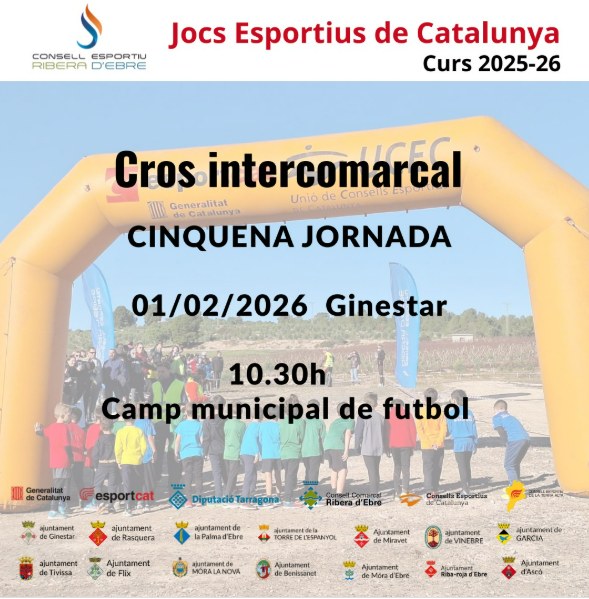 Organitzador Consell Esportiu de la Ribera d'Ebre Web http://www.rece.cat/ Llegir més Lloc Ginestar Ginestar, Espanya Mes informació Llegir més Data 01 febr. 2026 Caducat! Hora 10:30 - 12:00 Municipi Ginestar 5a jornada de Cros Intercomarcal a Ginestar Comparteix aquest esdeveniment + Afegir a Google Calendar Exportació a + iCal / Outlook L'acte s'ha acabat.