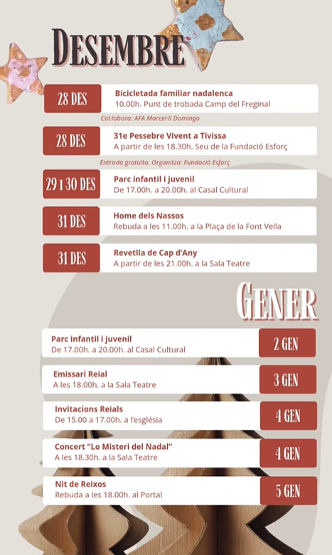 Organitzador Ajuntament de Tivissa Telèfon 977 418 014 Correu electrònic turisme@tivissa.cat Web http://www.tivissa.cat/ Llegir més Lloc Tivissa Tivissa, Espanya Mes informació Llegir més Data 30 des. 2025 - 05 gen. 2026 Caducat! Hora Activitat de tot el dia Municipi Tivissa Activitats de Nadal a Tivissa Comparteix aquest esdeveniment + Afegir a Google Calendar Exportació a + iCal / Outlook L'acte s'ha acabat.