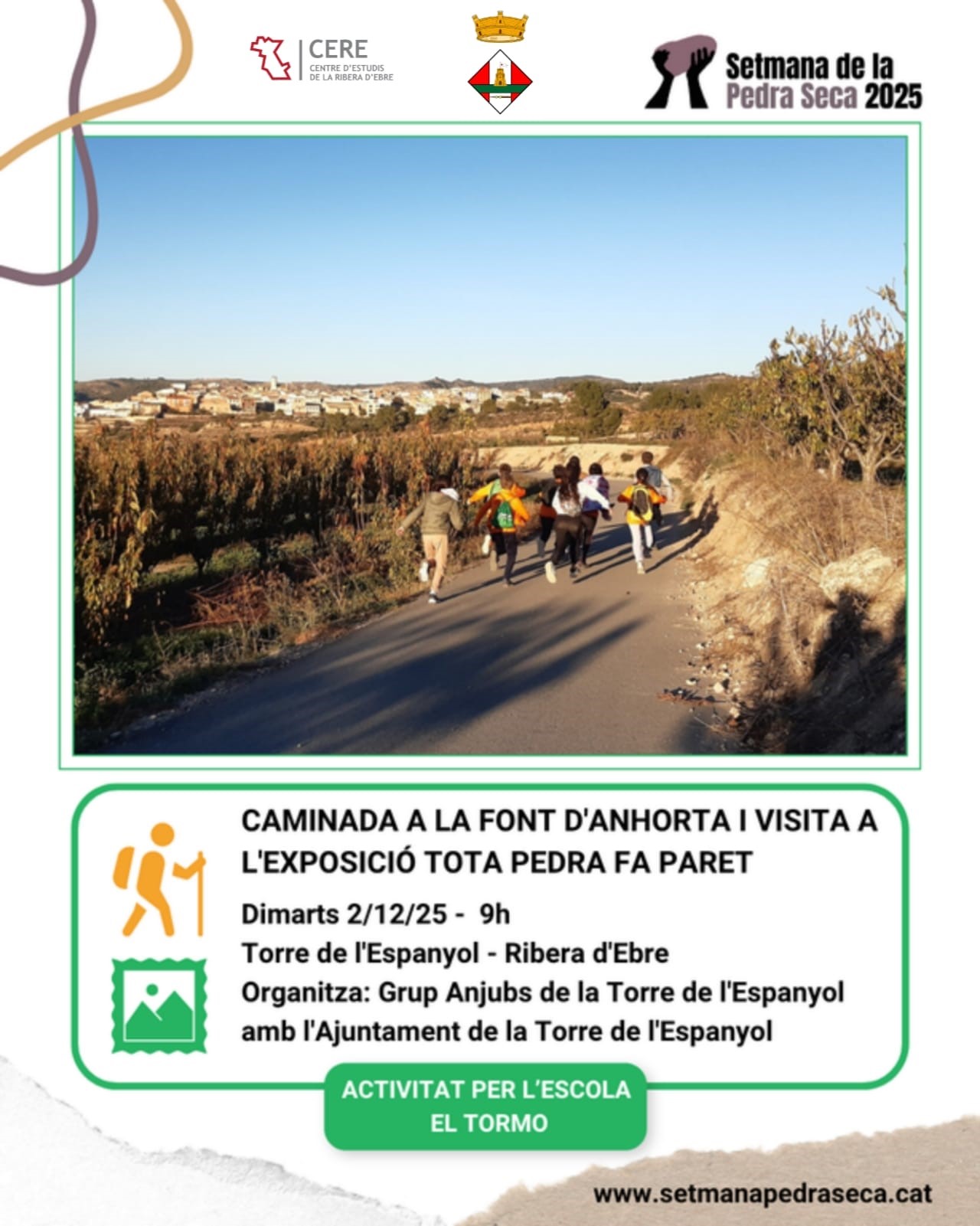 Llegir més Lloc Torre de l'Espanyol La Torre de l'Espanyol, Espanya Mes informació Llegir més Data 02 des. 2025 Hora 19:00 - 20:00 Municipi Rasquera Caminada a la font d’Anhorta i visita a l’exposició ‘Tota pedra fa paret’ Comparteix aquest esdeveniment + Afegir a Google Calendar Exportació a + iCal / Outlook