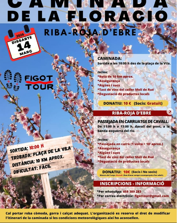 Organitzador Figot-T Senderisme Telèfon 658389283 Correu electrònic figottour@gmail.com Llegir més Lloc Riba-roja d'Ebre Riba-roja d'Ebre, Espanya Mes informació Llegir més Data 14 març 2026 Hora 10:00 - 18:00 Municipi Riba-Roja d'Ebre Caminada de la floració Comparteix aquest esdeveniment + Afegir a Google Calendar Exportació a + iCal / Outlook