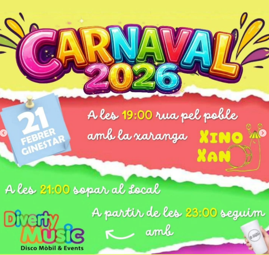Organitzador Ajuntament de Ginestar Telèfon 977 409 005 Correu electrònic ginestar@ginestar.cat Web http://www.ginestar.cat Llegir més Lloc Ginestar Ginestar, Espanya Mes informació Llegir més Data 21 febr. 2026 Hora 19:00 - 23:55 Municipi Ginestar Carnaval a Ginestar Comparteix aquest esdeveniment + Afegir a Google Calendar Exportació a + iCal / Outlook