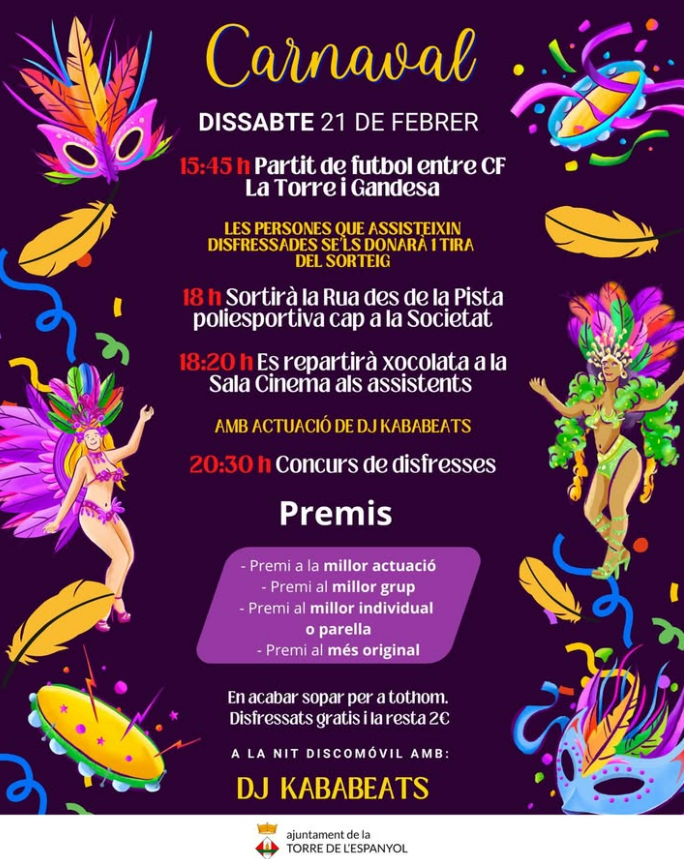 Organitzador Ajuntament de la Torre de l'Espanyol Telèfon 977 405 815 Correu electrònic ajuntament@torredelespanyol.cat Web http://www.torredelespanyol.cat/ Llegir més Lloc Torre de l'Espanyol La Torre de l'Espanyol, Espanya Mes informació Llegir més Data 21 febr. 2026 Hora 15:45 - 23:55 Municipi La Torre de l'Espanyol CARNAVAL A LA TORRE DE L’ESPANYOL Comparteix aquest esdeveniment + Afegir a Google Calendar Exportació a + iCal / Outlook