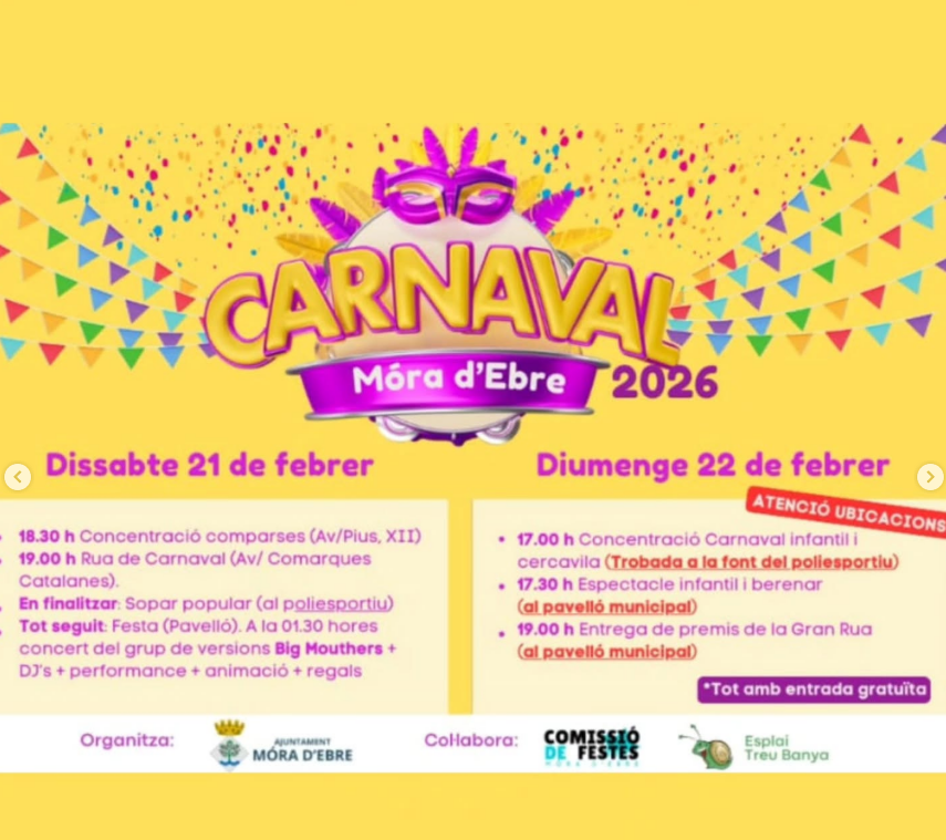 Organitzador Ajuntament de Móra d'Ebre Telèfon 977400012 Correu electrònic ajuntament@moradebre.cat Llegir més Lloc Móra d'Ebre Móra d'Ebre, Espanya Mes informació Llegir més Data 21 - 22 febr. 2026 Hora Activitat de tot el dia Municipi Móra d'Ebre Carnaval a Móra d’Ebre Comparteix aquest esdeveniment + Afegir a Google Calendar Exportació a + iCal / Outlook
