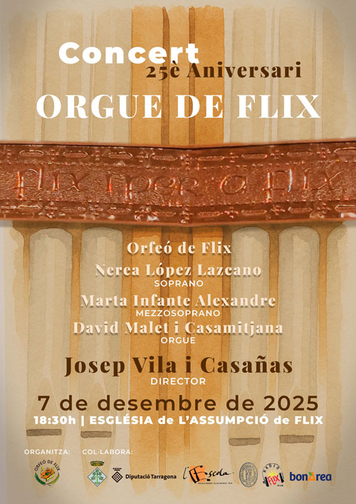 Organitzador Ajuntament de Flix Telèfon 977 410 153 Correu electrònic aj.flix@altanet.org Web http://www.flix.cat/ Llegir més Lloc Pl. de l'Església de Flix Mes informació Llegir més Data 07 des. 2025 Hora 18:30 - 20:00 Municipi Flix Concert 25è aniversari Orgue de Flix Comparteix aquest esdeveniment + Afegir a Google Calendar Exportació a + iCal / Outlook