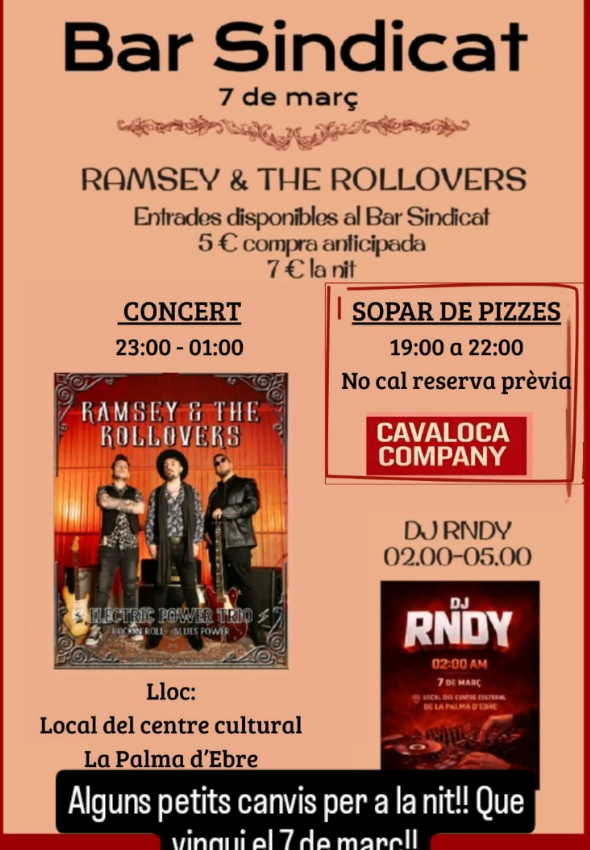 Llegir més Lloc La Palma d'Ebre La Palma d'Ebre, Espanya Mes informació Llegir més Data 07 març 2026 Hora 19:00 - 23:00 Municipi La Palma d'Ebre Concert al Sindicat Comparteix aquest esdeveniment + Afegir a Google Calendar Exportació a + iCal / Outlook