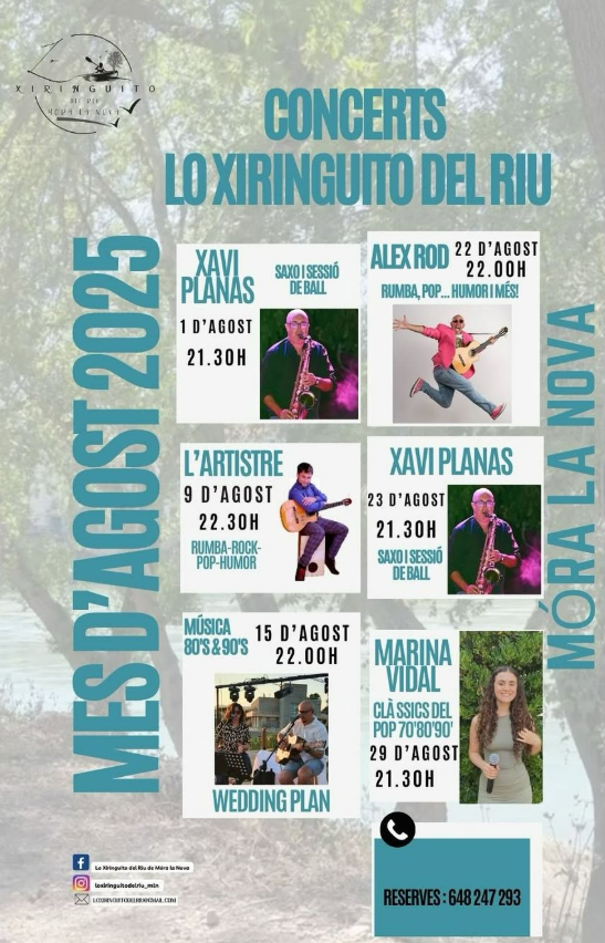 Llegir més Lloc Embarcador de Móra la Nova Móra la Nova, Espanya Mes informació Llegir més Data 09 ag. 2025 Caducat! Hora 22:30 - 23:55 Municipi Móra la Nova Concerts a Lo Xiringuito del Riu Comparteix aquest esdeveniment + Afegir a Google Calendar Exportació a + iCal / Outlook L'acte s'ha acabat.