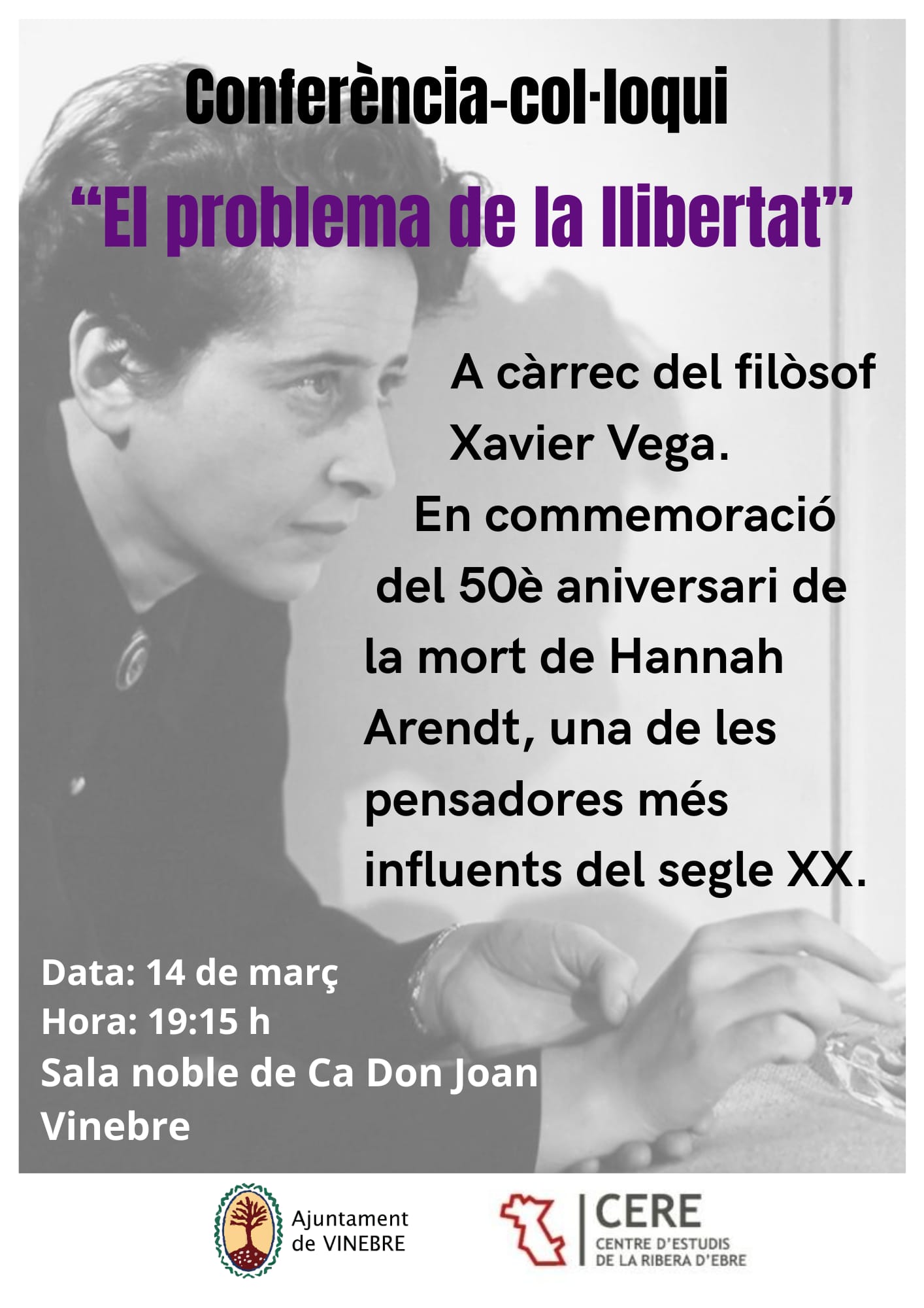 Organitzador Ajuntament de Vinebre Telèfon 977 405781 Llegir més Lloc Ca Don Joan Plaça de la Constitució, Vinebre, España Mes informació Llegir més Data 14 març 2026 Hora 19:15 - 21:00 Municipi Vinebre Conferència-col·loqui: ‘El problema de la llibertat’, a càrrec de Xavier Vega Comparteix aquest esdeveniment + Afegir a Google Calendar Exportació a + iCal / Outlook