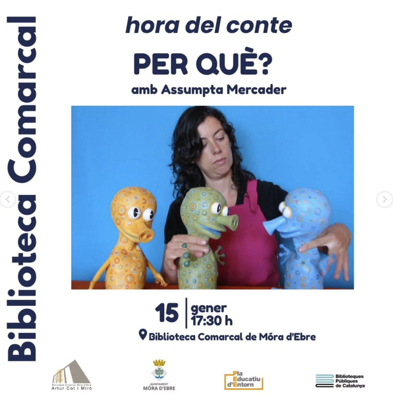 Organitzador Biblioteca Artur Cot Telèfon 977 400 406 Correu electrònic biblioteca@moradebre.cat Web http://www.moradebre.cat/equipament/biblioteca/ Llegir més Lloc Biblioteca Comarcal Móra d'Ebre, Espanya Mes informació Llegir més Data 15 gen. 2026 Hora 17:30 - 19:00 Municipi Móra d'Ebre Hora del conte, per què? Comparteix aquest esdeveniment + Afegir a Google Calendar Exportació a + iCal / Outlook