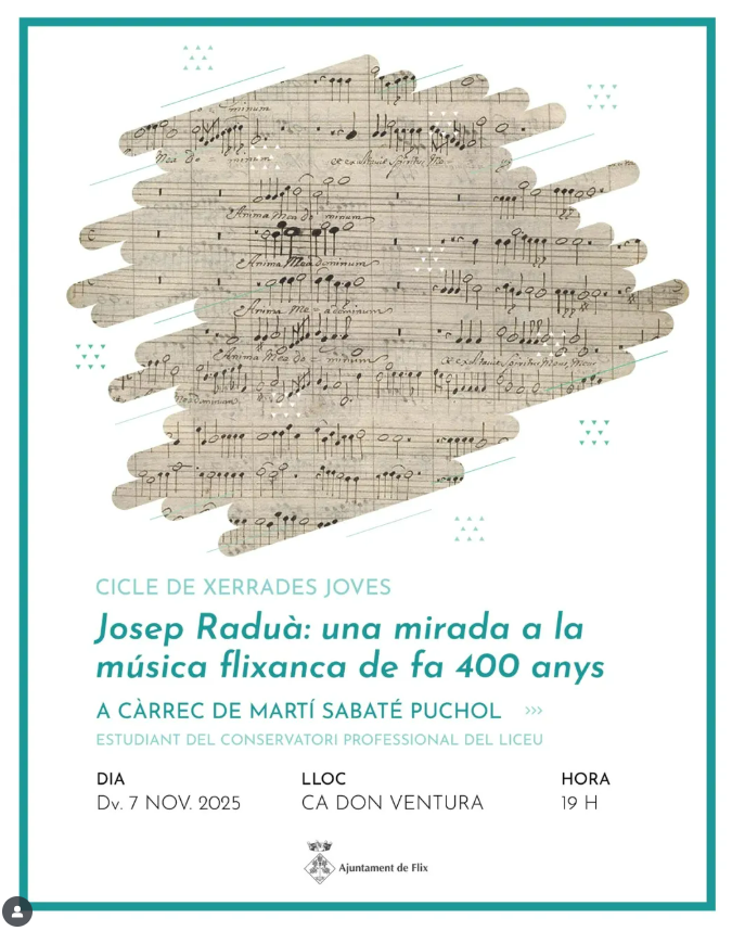 Organitzador Ajuntament de Flix Telèfon 977 410 153 Correu electrònic aj.flix@altanet.org Web http://www.flix.cat/ Llegir més Lloc Ca Don Ventura Flix, Espanya Mes informació Llegir més Data 07 nov. 2025 Caducat! Hora 19:00 - 21:00 Municipi Flix : “Josep Raduà: una mirada a la música flixanca de fa 400 anys”, a càrrec de Martí Sabaté Comparteix aquest esdeveniment + Afegir a Google Calendar Exportació a + iCal / Outlook L'acte s'ha acabat.
