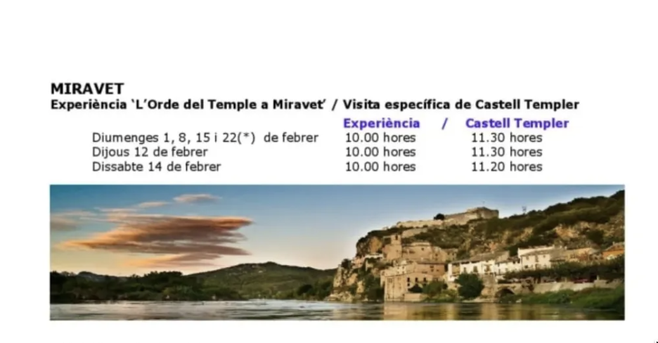 Organitzador TAVITUR Telèfon 691.561.868 Correu electrònic tarvitur@gmail.com Web http://tarvitur.blogspot.com/ Llegir més Lloc Miravet Miravet, Espanya Mes informació Llegir més Data 08 febr. 2026 Hora 11:30 - 14:00 Municipi Tivissa Miravet. Experiència: ‘L’Orde del Temple a Miravet’ Comparteix aquest esdeveniment + Afegir a Google Calendar Exportació a + iCal / Outlook