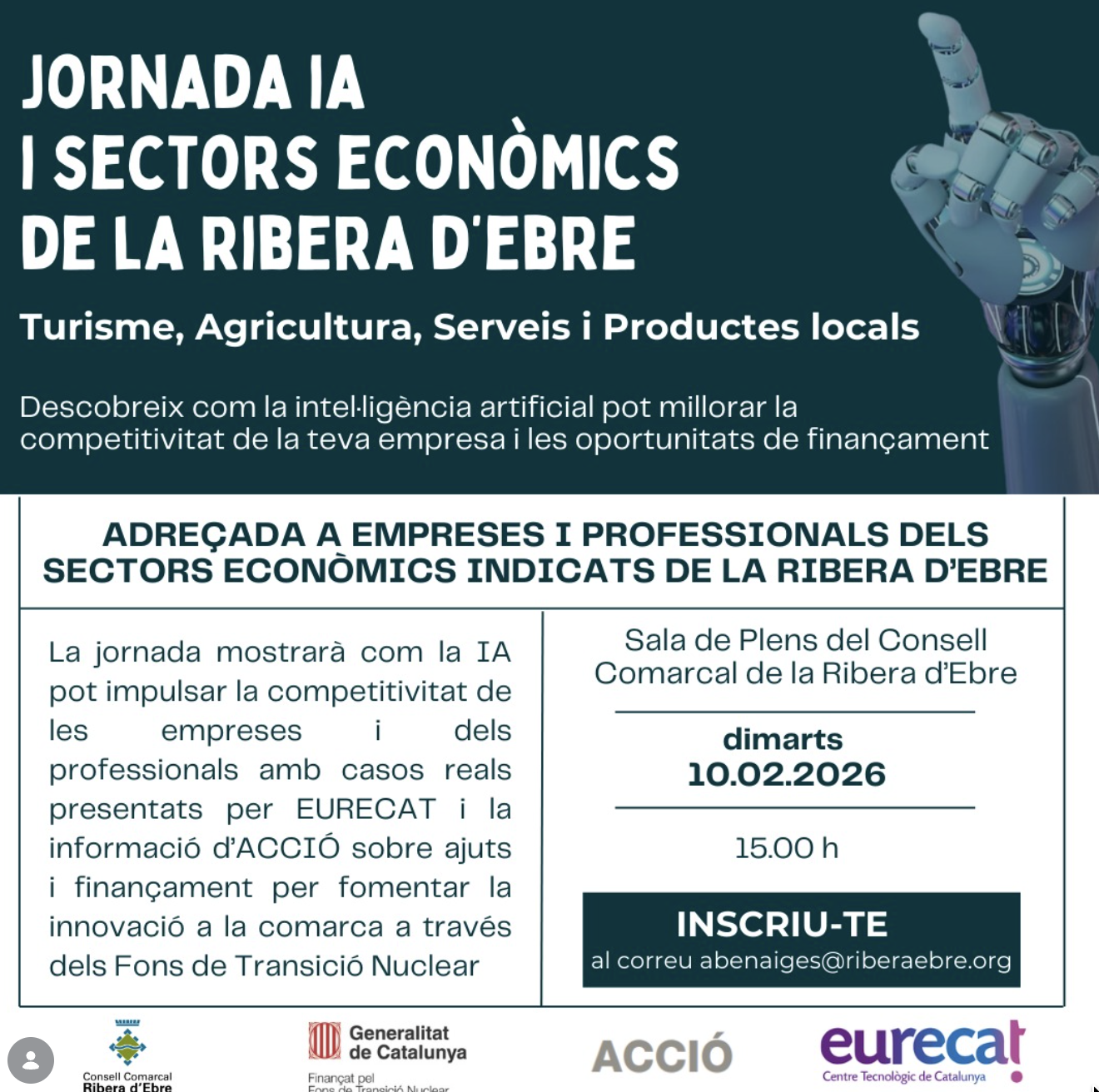Organitzador Consell Comarcal de la Ribera d'Ebre Telèfon 977 401 851 Correu electrònic consell@riberaebre.org Web http://www.riberaebre.org/ Llegir més Lloc Consell Comarcal de la Ribera d'Ebre Móra d'Ebre, Espanya Mes informació Llegir més Data 10 febr. 2026 Hora 15:00 - 17:00 Municipi Móra d'Ebre ornada sobre IA i Sectors Econòmics de la Ribera d’Ebre Comparteix aquest esdeveniment + Afegir a Google Calendar Exportació a + iCal / Outlook