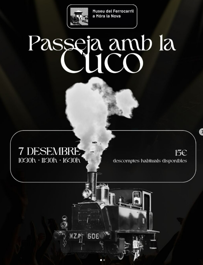Organitzador Museu del Ferrocarril Telèfon 977 401 705/ 616 091 470 Correu electrònic info@museuferrocarril.cat Web http://www.museuferrocarril.cat/ Llegir més Lloc Museu del Ferrocarril Móra la Nova Mes informació Llegir més Data 07 des. 2025 Hora Activitat de tot el dia Municipi Móra la Nova Passejada amb La Cuco Comparteix aquest esdeveniment + Afegir a Google Calendar Exportació a + iCal / Outlook