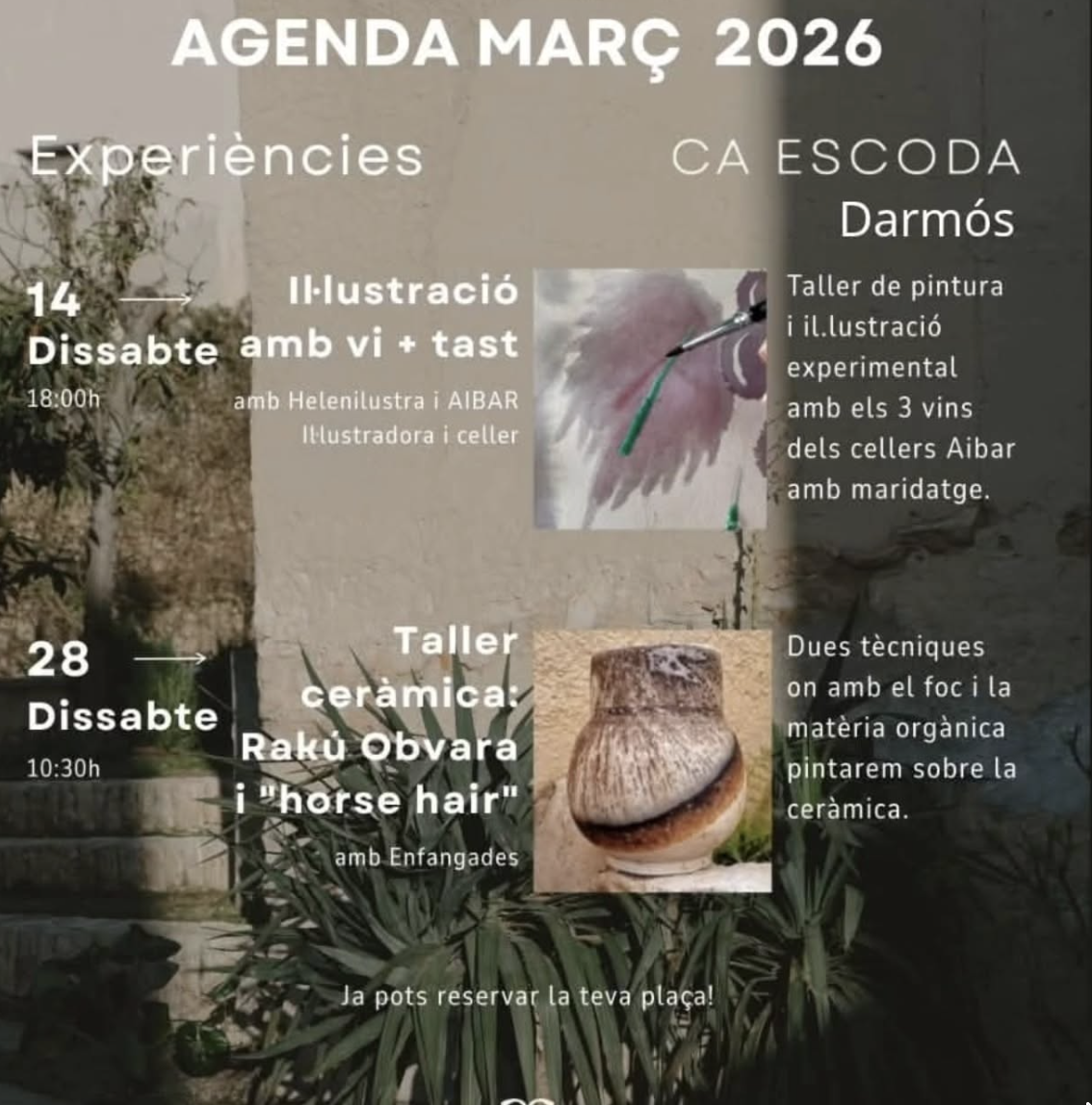 Organitzador Ca Escoda Llegir més Lloc Darmós Darmós, Espanya Mes informació Llegir més Data 28 febr. 2026 Hora 10:30 - 15:00 Taller de ceràmica Comparteix aquest esdeveniment + Afegir a Google Calendar Exportació a + iCal / Outlook