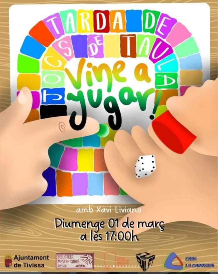 Organitzador Ajuntament de Tivissa Telèfon 977 418 014 Correu electrònic turisme@tivissa.cat Web http://www.tivissa.cat/ Llegir més Lloc Biblioteca Mestre Cabré de Tivissa Tivissa, Espanya Mes informació Llegir més Data 01 març 2026 Hora 17:00 - 18:00 Municipi Tivissa Tarda de Jocs amb Xavi Liviano Comparteix aquest esdeveniment + Afegir a Google Calendar Exportació a + iCal / Outlook