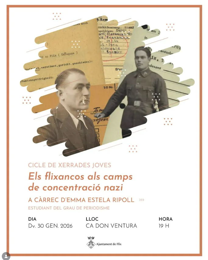 Organitzador Ajuntament de Flix Telèfon 977 410 153 Correu electrònic aj.flix@altanet.org Web http://www.flix.cat/ Llegir més Lloc Ca Don Ventura Flix, Espanya Mes informació Llegir més Data 30 gen. 2026 Caducat! Hora 19:00 - 21:00 Municipi Benissanet xerrada “Els flixancos als camps de concentració nazi”, a càrrec d’Emma Estela Comparteix aquest esdeveniment + Afegir a Google Calendar Exportació a + iCal / Outlook L'acte s'ha acabat.