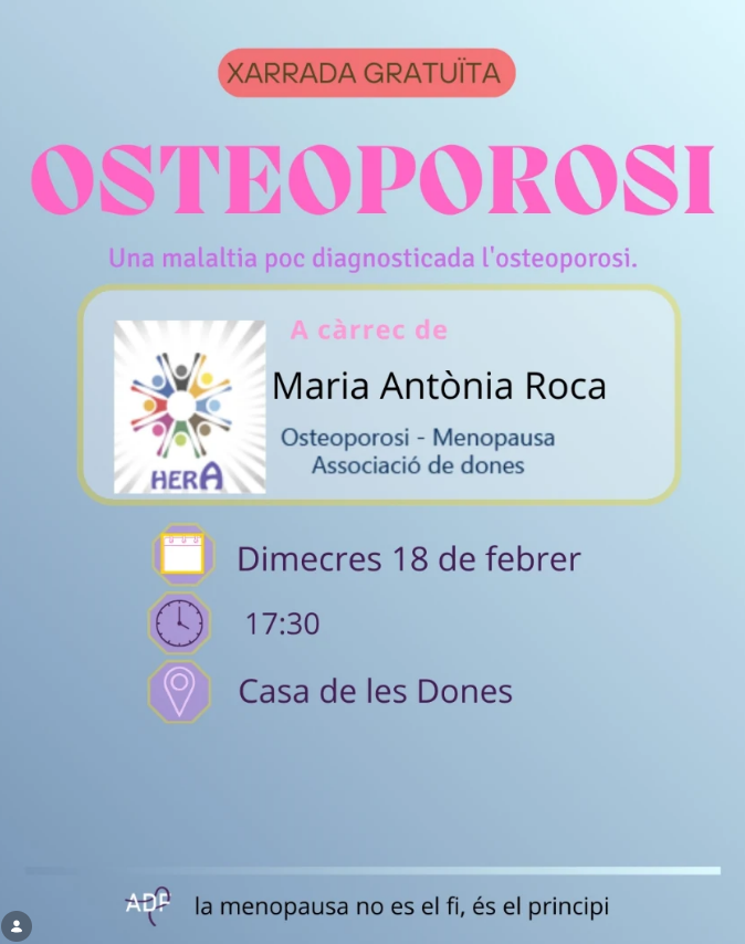 Organitzador Associació de Dones de Flix Correu electrònic associaciodonesflix@gmail.com Llegir més Lloc Flix Flix, Espanya Mes informació Llegir més Data 18 febr. 2026 Hora 17:30 - 19:00 Municipi Flix XERRADA OSTEOPOROSI Comparteix aquest esdeveniment + Afegir a Google Calendar Exportació a + iCal / Outlook